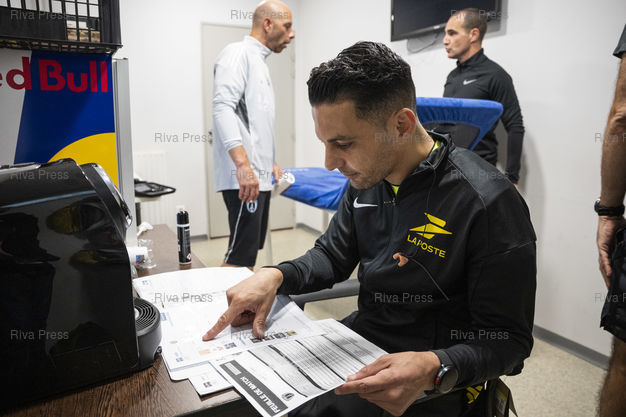 Légende : Karim Abed, quatrieme arbitre du match Paris FC-Lorient comptant pour la 7eme journee de Ligue 1, verifie dans le vestiaire avant la rencontre que les numeros de licence des joueurs correspondent bien a ceux inscrits sur la feuille de match. A Paris, le 03/10/2205 /// Karim Abed, fourth referee for the Paris FC-Lorient match on Matchday 7 of French Ligue 1, check in the locker room before the match that the players' license numbers match those on the match sheet. In Paris. On October 3, 2025 /// PHOTO VIncent Boisot