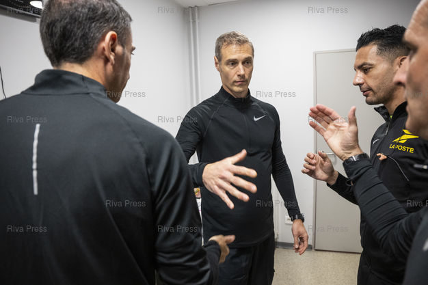 Légende : Benoit Millot, arbitre principal du match Paris FC-Lorient comptant pour la 7eme journee de Ligue 1, ses deux assistants (Christophe Mouysset et Huseyin Ocak) et le quatrieme arbitre de la rencontre Karim Abed se tapent dans les mains dans leur vestiaire avant de partir a l'echauffement. A Paris, le 03/10/2205 /// Benoit Millot, head referee for the Paris FC-Lorient match on Matchday 7 of French Ligue 1, his two assistants (Christophe Mouysset and Huseyin Ocak) and the fourth referee of the match Karim Abed clap hands in their locker room before leaving for the warm-up. On October 3, 2025 /// PHOTO VIncent Boisot