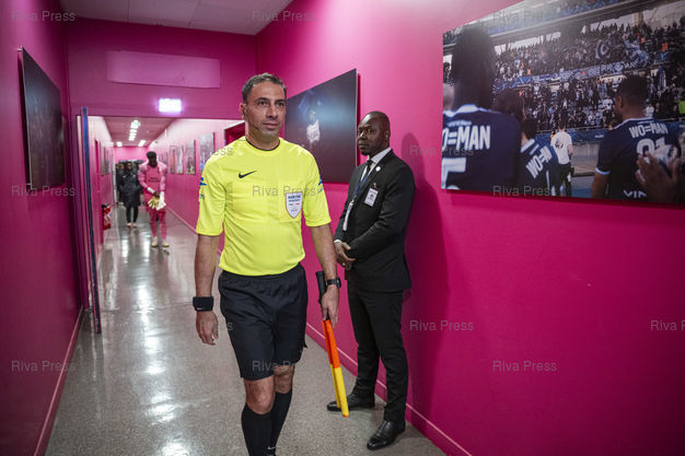 Légende : Huseyin Ocak, arbitre assistant de la rencontre Paris FC-Lorient comptant pour la 7eme journee de Ligue 1, quitte son vestiaire pour la premiere mi-temps du match. A Paris, le 03/10/2205 /// Huseyin Ocak, assistant referee for the Paris FC-Lorient match on Matchday 7 of French Ligue 1, leaves his locker room for the first half of the match. In Paris. On October 3, 2025 /// PHOTO VIncent Boisot