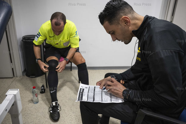 Légende : Benoit Millot, arbitre principal de la rencontre Paris FC-Lorient comptant pour la 7eme journee de Ligue 1, et le quatrieme arbitre de la Karim Abed debriefent a la mi temps du match. A Paris, le 03/10/2205 /// Benoit Millot, head referee for the Paris FC-Lorient match on Matchday 7 of French Ligue 1, and the fourth referee of the Karim Abed debriefs at half-time of the match. In Paris. On October 3, 2025 /// PHOTO VIncent Boisot
