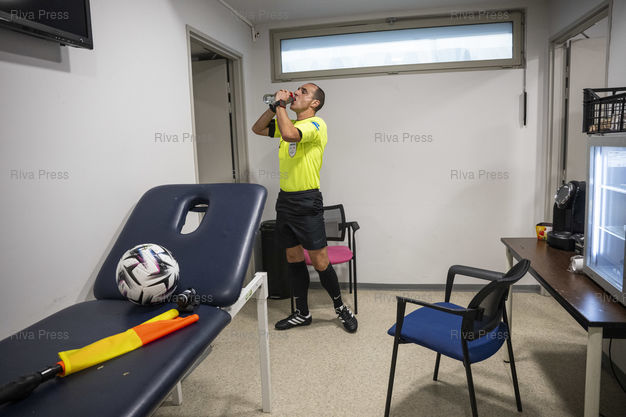 Légende : Benoit Millot, arbitre principal de la rencontre Paris FC-Lorient comptant pour la 7eme journee de Ligue 1, se desaltere dans son vestiaire a la mi temps du match. A Paris, le 03/10/2205 /// Benoit Millot, head referee for the Paris FC-Lorient match on Matchday 7 of French Ligue 1, prepares to return to the field for the second half of the match. In Paris. On October 3, 2025 /// PHOTO VIncent Boisot