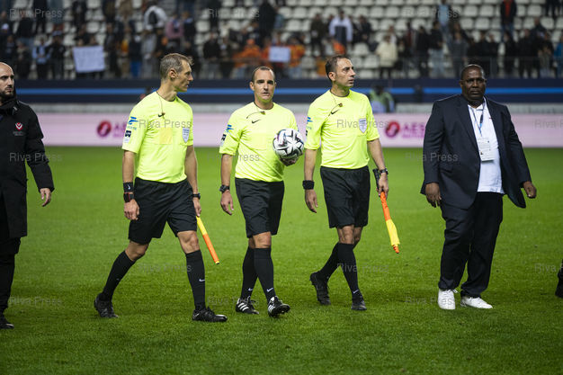 Légende : Benoit Millot, arbitre principal du match Paris FC-Lorient comptant pour la 7eme journee de Ligue 1, ses deux assistants (Christophe Mouysset et Huseyin Ocak) et le quatrieme arbitre Karim Abed quittent la pelouse a la fin du match, accompagnes par le commissaire aux arbitres du PFC Eddy Cellamen (a droite). A Paris, le 03/10/2205 /// Benoit Millot, head referee for the Paris FC-Lorient match on Matchday 7 of French Ligue 1, his two assistants (Christophe Mouysset and Huseyin Ocak) and the fourth referee Karim Abed leave the pitch at the end of the match, accompanied by PFC referee commissioner Eddy Cellamen (right). In Paris. On October 3, 2025 /// PHOTO VIncent Boisot