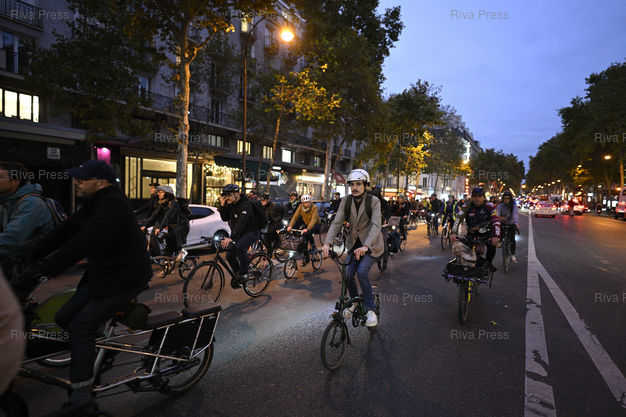 Légende : Rassemblement en la mémoire du cycliste Paul Varry, mortellement percuté par un automobiliste en SUV roulant sur une piste cyclable à la suite d'une altercation il y a un an à Paris. La Sécurité routière lance une campagne contre l'agressivité au volant /// Rally in memory of cyclist Paul Varry, fatally struck by a driver in an SUV driving on a cycle path following an altercation a year ago in Paris. Road safety launches a campaign against aggressive driving - Paris - 15/10/2025 - Photo © Lionel Préau +33 (0)6 68 12 83 77