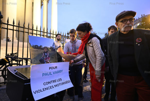 Légende : Rassemblement en la mémoire du cycliste Paul Varry, mortellement percuté par un automobiliste en SUV roulant sur une piste cyclable à la suite d'une altercation il y a un an à Paris. La Sécurité routière lance une campagne contre l'agressivité au volant. Anne Monmarché, presidente de Paris en selle, et la mère de Paul Varry /// Rally in memory of cyclist Paul Varry, fatally struck by a driver in an SUV driving on a cycle path following an altercation a year ago in Paris. Road safety launches a campaign against aggressive driving. Anne Monmarché, president of Paris en selle, and Paul Varry's mother - Paris - 15/10/2025 - Photo © Lionel Préau +33 (0)6 68 12 83 77