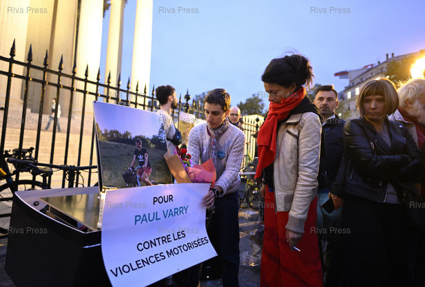 Légende : Rassemblement en la mémoire du cycliste Paul Varry, mortellement percuté par un automobiliste en SUV roulant sur une piste cyclable à la suite d'une altercation il y a un an à Paris. La Sécurité routière lance une campagne contre l'agressivité au volant. Anne Monmarché, presidente de Paris en selle, et la mère de Paul Varry /// Rally in memory of cyclist Paul Varry, fatally struck by a driver in an SUV driving on a cycle path following an altercation a year ago in Paris. Road safety launches a campaign against aggressive driving. Anne Monmarché, president of Paris en selle, and Paul Varry's mother - Paris - 15/10/2025 - Photo © Lionel Préau +33 (0)6 68 12 83 77