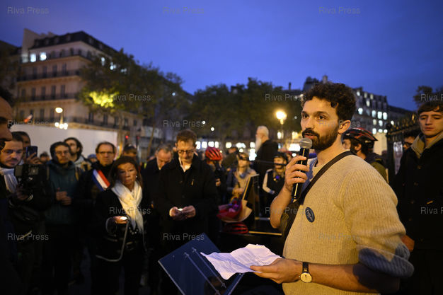 Légende : Rassemblement en la mémoire du cycliste Paul Varry, mortellement percuté par un automobiliste en SUV roulant sur une piste cyclable à la suite d'une altercation il y a un an à Paris. La Sécurité routière lance une campagne contre l'agressivité au volant /// Rally in memory of cyclist Paul Varry, fatally struck by a driver in an SUV driving on a cycle path following an altercation a year ago in Paris. Road safety launches a campaign against aggressive driving - Paris - 15/10/2025 - Photo © Lionel Préau +33 (0)6 68 12 83 77