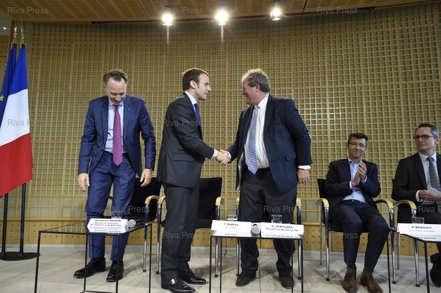Emmanuel Macron salue Grégoire Sentilhes, Président de NextStage AM, en présence de Thomas Buberl, DGA d'Axa, Philippe Benquet, Président d'Acorus, et Olivier Raulin, Président d'Adopt' - Paris - 05/07/2016 - Photo © Lionel Préau +33 (0)6 68 12 83 77
