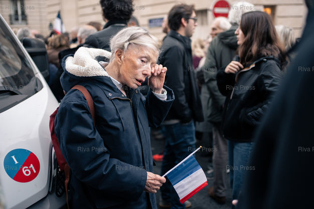Légende : Des sympathisants de Nicolas sarkozy peu avant que l'ancien President de la Republique sorte de son domicile du 16e arrondissement de Paris pour aller rejoindre la prison de la Sante dans le 14e arrondissement, ou il est incarcere le mardi 21 octobre, presque un mois après sa condamnation pour association de malfaiteurs dans l'affaire des soupçons de financement libyen de sa campagne présidentielle en 2007.