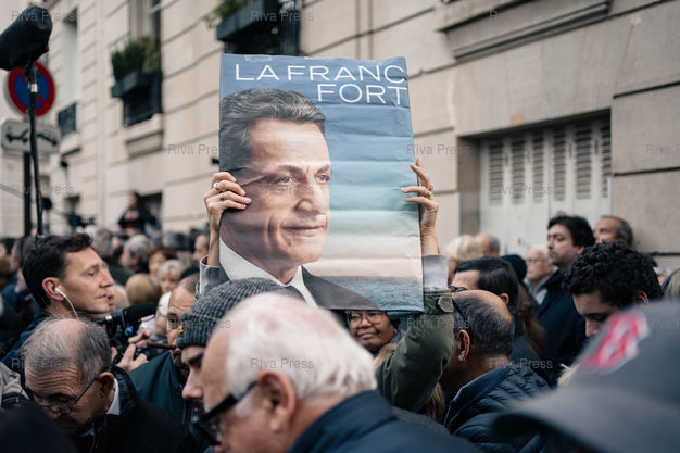 Légende : Des sympathisants de Nicolas Sarkozy peu avant que l'ancien President de la Republique sorte de son domicile du 16e arrondissement de Paris pour aller rejoindre la prison de la Sante dans le 14e arrondissement, ou il est incarcere le mardi 21 octobre, presque un mois après sa condamnation pour association de malfaiteurs dans l'affaire des soupçons de financement libyen de sa campagne présidentielle en 2007.