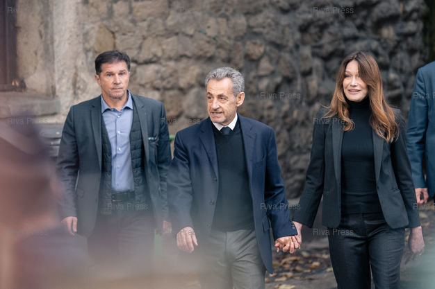 Légende : Nicolas Sarkozy et Carla Bruni sortent de leur domicile du 16e arrondissement de Paris alors que l'ancien President de la Republique se rend a la prison de la Sante dans le 14e arrondissement ou il est incarcere le mardi 21 octobre, presque un mois après sa condamnation pour association de malfaiteurs dans l'affaire des soupçons de financement libyen de sa campagne présidentielle en 2007.