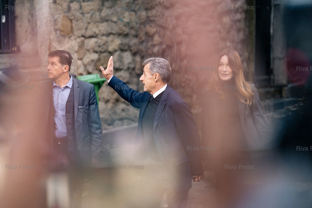 Légende : Nicolas Sarkozy et Carla Bruni sortent de leur domicile du 16e arrondissement de Paris alors que l'ancien President de la Republique se rend a la prison de la Sante dans le 14e arrondissement ou il est incarcere le mardi 21 octobre, presque un mois après sa condamnation pour association de malfaiteurs dans l'affaire des soupçons de financement libyen de sa campagne présidentielle en 2007.