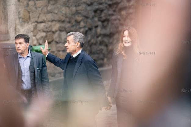 Légende : Nicolas Sarkozy et Carla Bruni sortent de leur domicile du 16e arrondissement de Paris alors que l'ancien President de la Republique se rend a la prison de la Sante dans le 14e arrondissement ou il est incarcere le mardi 21 octobre, presque un mois après sa condamnation pour association de malfaiteurs dans l'affaire des soupçons de financement libyen de sa campagne présidentielle en 2007.