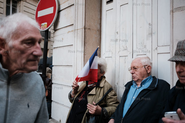 Légende : Des sympathisants de Nicolas sarkozy peu avant que l'ancien President de la Republique sorte de son domicile du 16e arrondissement de Paris pour aller rejoindre la prison de la Sante dans le 14e arrondissement, ou il est incarcere le mardi 21 octobre, presque un mois après sa condamnation pour association de malfaiteurs dans l'affaire des soupçons de financement libyen de sa campagne présidentielle en 2007.