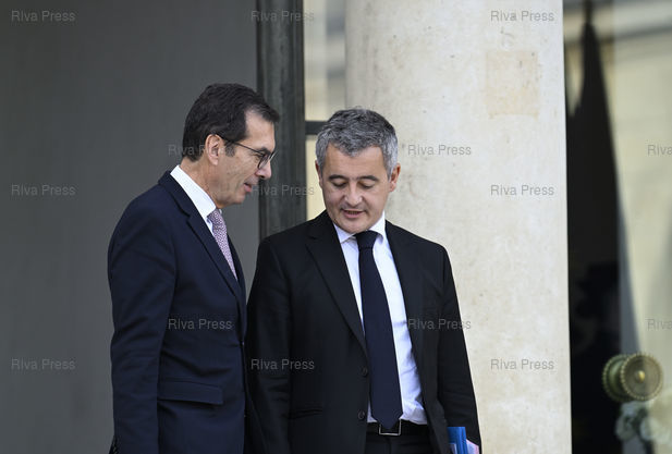 Légende : Conseil des ministres au palais de l'Elysée. Jean-Pierre Farandou, ministre du travail et des solidarités - Gérald Darmanin, ministre de la justice /// Council of ministers at the Elysee Palace. Jean-Pierre Farandou, Minister of Labor and Solidarity - Gérald Darmanin, Minister of Justice - Paris - 22/10/2025 - Photo © Lionel Préau +33 (0)6 68 12 83 77