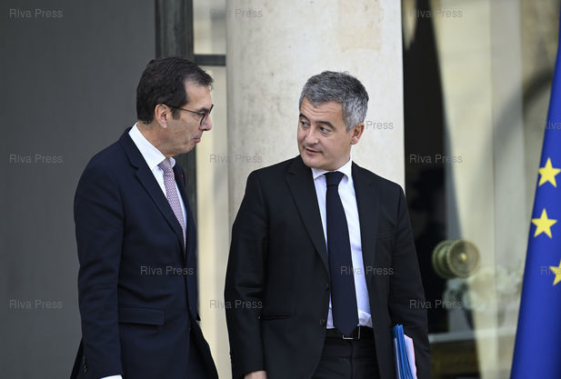 Légende : Conseil des ministres au palais de l'Elysée. Jean-Pierre Farandou, ministre du travail et des solidarités - Gérald Darmanin, ministre de la justice /// Council of ministers at the Elysee Palace. Jean-Pierre Farandou, Minister of Labor and Solidarity - Gérald Darmanin, Minister of Justice - Paris - 22/10/2025 - Photo © Lionel Préau +33 (0)6 68 12 83 77