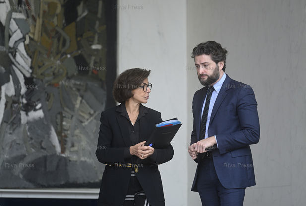 Légende : Conseil des ministres au palais de l'Elysée. Rachida Dati, ministre de la culture - Jonas Bayard, conseiller communication nationale /// Council of ministers at the Elysee Palace. Rachida Dati, Minister of Culture - Jonas Bayard, national communications advisor - Paris - 22/10/2025 - Photo © Lionel Préau +33 (0)6 68 12 83 77