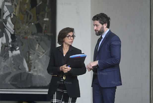Légende : Conseil des ministres au palais de l'Elysée. Rachida Dati, ministre de la culture - Jonas Bayard, conseiller communication nationale /// Council of ministers at the Elysee Palace. Rachida Dati, Minister of Culture - Jonas Bayard, national communications advisor - Paris - 22/10/2025 - Photo © Lionel Préau +33 (0)6 68 12 83 77