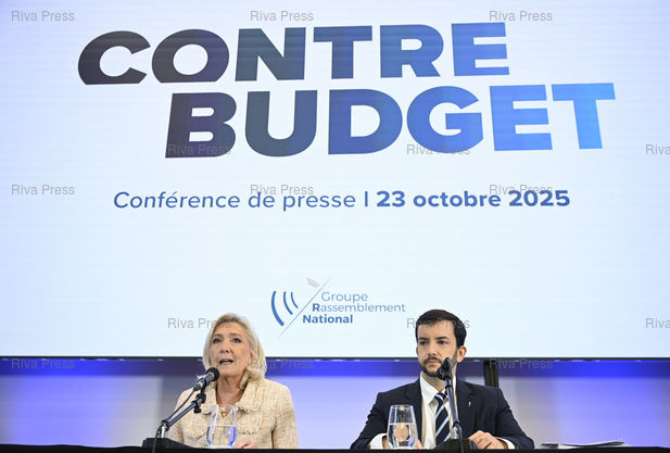 Légende : Le Rassemblement national présente son contre-budget pour le projet de loi de finances - PLF 2026. Marine Le Pen, présidente du groupe RN à l'Assemblée nationale - Jean-Philippe Tanguy, député de la Somme /// The Rssemblement National party presents its counter-budget for the draft finance bill 2026. Marine Le Pen, president of the RN group in the National Assembly - Jean-Philippe Tanguy, MP - Paris - 23/10/2025 - Photo © Lionel Préau +33 (0)6 68 12 83 77
