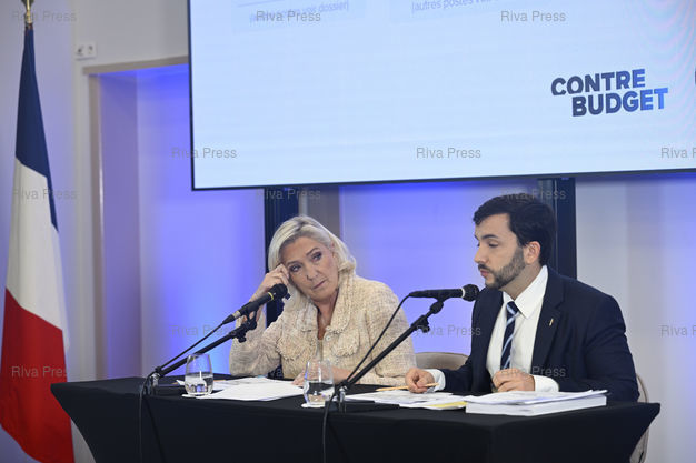 Légende : Le Rassemblement national présente son contre-budget pour le projet de loi de finances - PLF 2026. Marine Le Pen, présidente du groupe RN à l'Assemblée nationale - Jean-Philippe Tanguy, député de la Somme /// The Rssemblement National party presents its counter-budget for the draft finance bill 2026. Marine Le Pen, president of the RN group in the National Assembly - Jean-Philippe Tanguy, MP - Paris - 23/10/2025 - Photo © Lionel Préau +33 (0)6 68 12 83 77