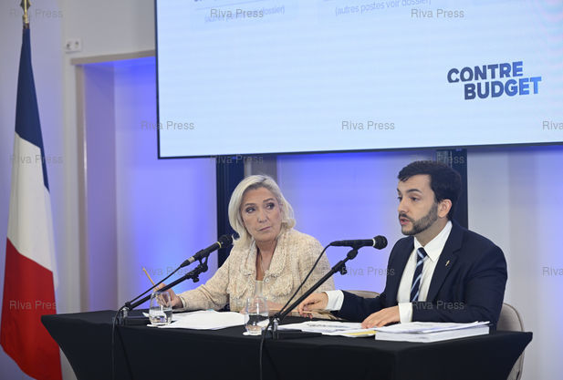 Légende : Le Rassemblement national présente son contre-budget pour le projet de loi de finances - PLF 2026. Marine Le Pen, présidente du groupe RN à l'Assemblée nationale - Jean-Philippe Tanguy, député de la Somme /// The Rssemblement National party presents its counter-budget for the draft finance bill 2026. Marine Le Pen, president of the RN group in the National Assembly - Jean-Philippe Tanguy, MP - Paris - 23/10/2025 - Photo © Lionel Préau +33 (0)6 68 12 83 77
