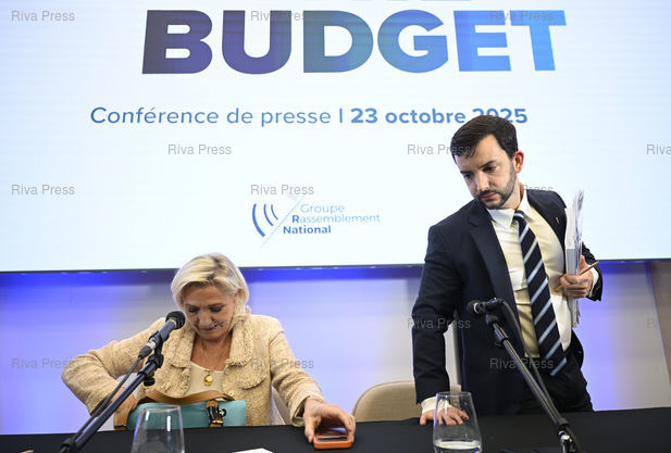 Légende : Le Rassemblement national présente son contre-budget pour le projet de loi de finances - PLF 2026. Marine Le Pen, présidente du groupe RN à l'Assemblée nationale - Jean-Philippe Tanguy, député de la Somme /// The Rssemblement National party presents its counter-budget for the draft finance bill 2026. Marine Le Pen, president of the RN group in the National Assembly - Jean-Philippe Tanguy, MP - Paris - 23/10/2025 - Photo © Lionel Préau +33 (0)6 68 12 83 77