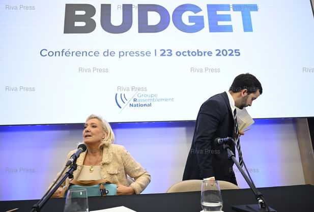 Légende : Le Rassemblement national présente son contre-budget pour le projet de loi de finances - PLF 2026. Marine Le Pen, présidente du groupe RN à l'Assemblée nationale - Jean-Philippe Tanguy, député de la Somme /// The Rssemblement National party presents its counter-budget for the draft finance bill 2026. Marine Le Pen, president of the RN group in the National Assembly - Jean-Philippe Tanguy, MP - Paris - 23/10/2025 - Photo © Lionel Préau +33 (0)6 68 12 83 77