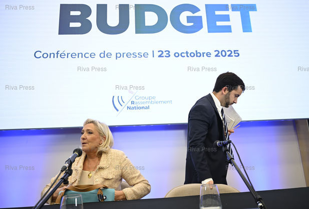 Légende : Le Rassemblement national présente son contre-budget pour le projet de loi de finances - PLF 2026. Marine Le Pen, présidente du groupe RN à l'Assemblée nationale - Jean-Philippe Tanguy, député de la Somme /// The Rssemblement National party presents its counter-budget for the draft finance bill 2026. Marine Le Pen, president of the RN group in the National Assembly - Jean-Philippe Tanguy, MP - Paris - 23/10/2025 - Photo © Lionel Préau +33 (0)6 68 12 83 77