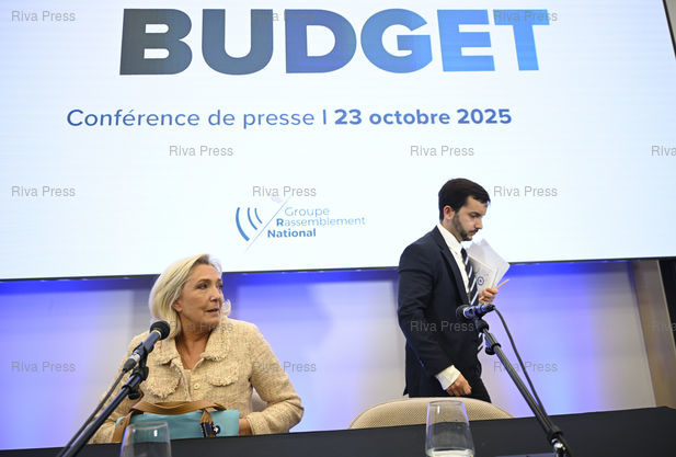 Légende : Le Rassemblement national présente son contre-budget pour le projet de loi de finances - PLF 2026. Marine Le Pen, présidente du groupe RN à l'Assemblée nationale - Jean-Philippe Tanguy, député de la Somme /// The Rssemblement National party presents its counter-budget for the draft finance bill 2026. Marine Le Pen, president of the RN group in the National Assembly - Jean-Philippe Tanguy, MP - Paris - 23/10/2025 - Photo © Lionel Préau +33 (0)6 68 12 83 77