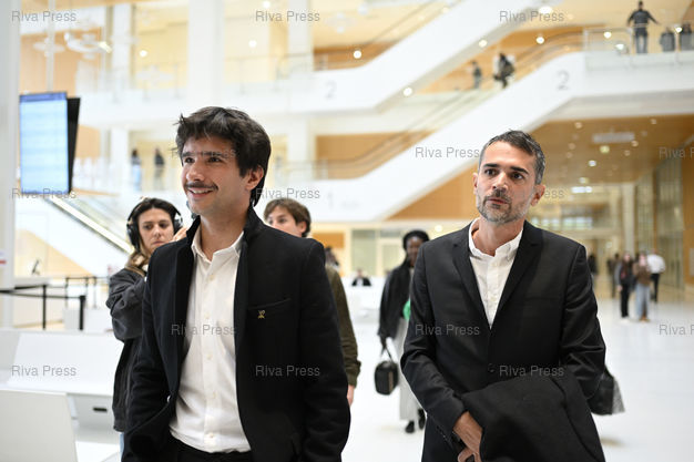 Légende : Procès pour cyberharcèlement sexiste à l'encontre de Brigitte Macron. Les prévenus avaient relayé sur les réseaux sociaux la fausse information selon laquelle la première dame est une femme transgenre. Le prévenu Aurélien Poirson-Atlan, alias "Zoé Sagan" et son avocat Juan Branco /// Trial for sexist cyberbullying against Brigitte Macron. The defendants had shared false information on social media that the first lady was a transgender woman. The defendant Aurélien Poirson-Atlan, alias "Zoé Sagan" and lawyer Juan Branco - Paris - 28/10/2025 - Photo © Lionel Préau +33 (0)6 68 12 83 77