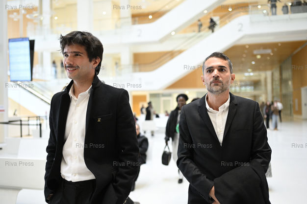 Légende : Procès pour cyberharcèlement sexiste à l'encontre de Brigitte Macron. Les prévenus avaient relayé sur les réseaux sociaux la fausse information selon laquelle la première dame est une femme transgenre. Le prévenu Aurélien Poirson-Atlan, alias "Zoé Sagan" et son avocat Juan Branco /// Trial for sexist cyberbullying against Brigitte Macron. The defendants had shared false information on social media that the first lady was a transgender woman. The defendant Aurélien Poirson-Atlan, alias "Zoé Sagan" and lawyer Juan Branco - Paris - 28/10/2025 - Photo © Lionel Préau +33 (0)6 68 12 83 77