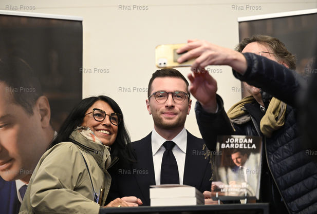 Légende : Jordan Bardella, président du Rassemblement national, lance son 2eme livre "Ce que veulent les Français" lors d'une soirée au Théâtre Marigny. Séance de dédicace /// Jordan Bardella, president of the Rassemblement National, launches his 2nd book "What the French want" during an evening at the Théâtre Marigny. Book signing session - Paris - 28/10/2025 - Photo © Lionel Préau +33 (0)6 68 12 83 77
