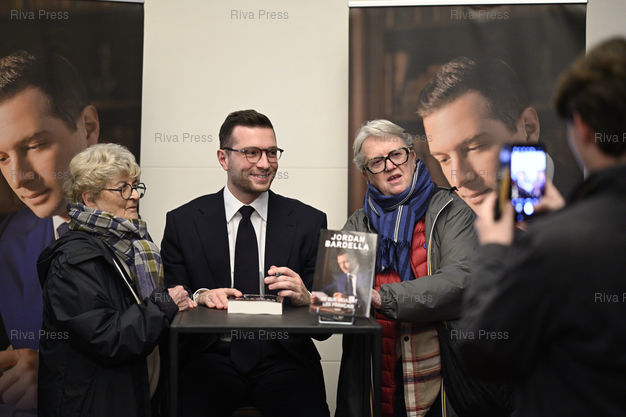 Légende : Jordan Bardella, président du Rassemblement national, lance son 2eme livre "Ce que veulent les Français" lors d'une soirée au Théâtre Marigny. Séance de dédicace /// Jordan Bardella, president of the Rassemblement National, launches his 2nd book "What the French want" during an evening at the Théâtre Marigny. Book signing session - Paris - 28/10/2025 - Photo © Lionel Préau +33 (0)6 68 12 83 77
