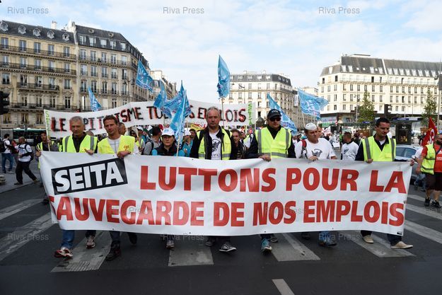 Légende : Des salariés en grève du cigarettier Seita manifestent, à l'appel de la CGT, contre le plan social de 366 suppressions d'emplois, de la Gare Saint-Lazare vers l'Assemblée Nationale - Paris - 22/09/2014 - Photo © Lionel Préau +33 (0)6 68 12 83 77