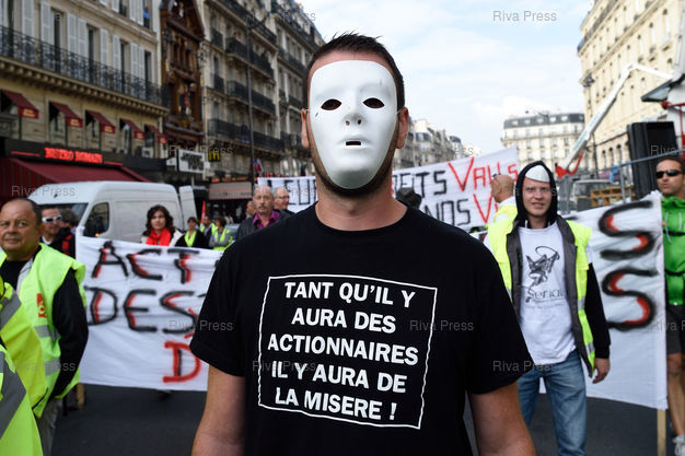 Légende : Des salariés en grève du cigarettier Seita manifestent, à l'appel de la CGT, contre le plan social de 366 suppressions d'emplois, de la Gare Saint-Lazare vers l'Assemblée Nationale - Paris - 22/09/2014 - Photo © Lionel Préau +33 (0)6 68 12 83 77