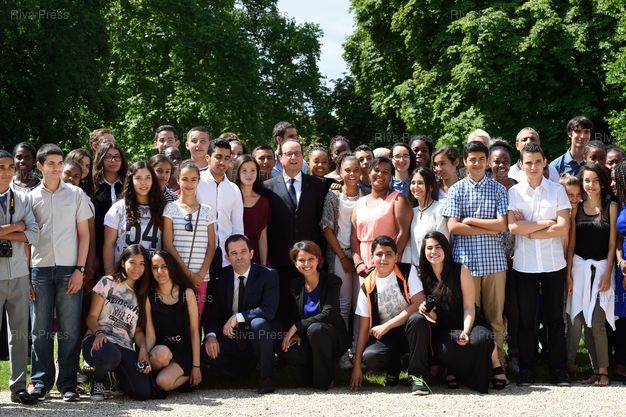 Photo de famille autour de François Hollande dans les jardins de l'Elysée, en présence de Benoit Hamon, ministre de l'Education nationale, de l'Enseignement supérieur et de la Recherche et de Mme Najat Vallaud-Belkacem, ministre des Droits des femmes, de la Ville, de la Jeunesse et des Sports - Paris - 15/07/2014 - Photo © Lionel Préau +33 (0)6 68 12 83 77