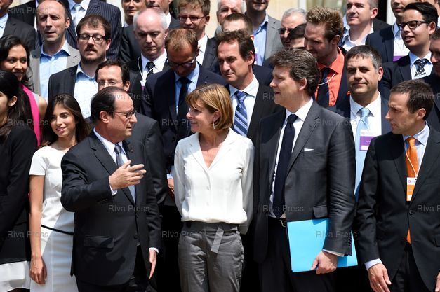 François Hollande échange avec Anne Lauvergeon, présidente de la commission «Innovation 2030» et Arnaud Montebourg lors de la photo de famille avec les lauréats - Paris - 23/07/2014 - Photo © Lionel Préau +33 (0)6 68 12 83 77