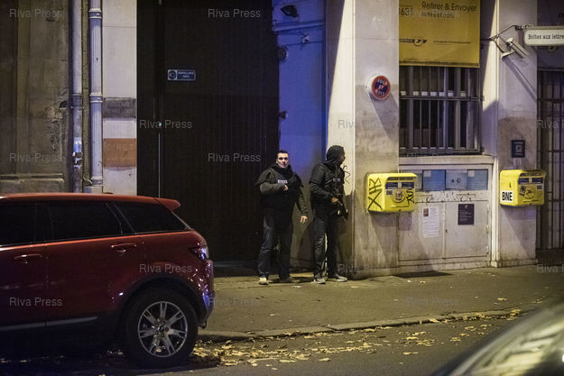 Légende : PARIS, 13/11/2015 - Des policiers prennent position autour du Bataclan alors qu'une attaque terroriste contre les spectateurs d'un concert est en cours dans cette salle de spectacle du 11eme arrondissement. /// Policemen in front of the Bataclan concert hall in central Paris, on November 13, 2015 during the terrorist attack where 90 persons were killed and hundreds injured. /// PHOTO Vincent BOISOT