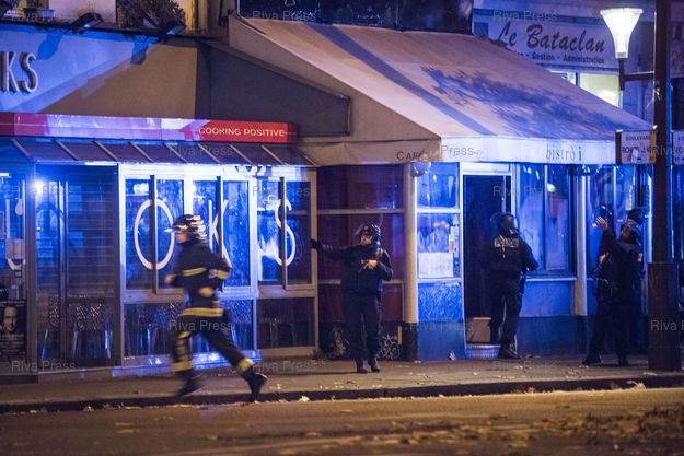 Légende : PARIS, 13/11/2015 - Policiers et pompiers devant le Bataclan alors qu'une attaque terroriste contre les spectateurs d'un concert est en cours dans cette salle de spectacle du 11eme arrondissement. /// Policemen and firemen in front of the Bataclan concert hall in central Paris, on November 13, 2015 during the terrorist attack where 90 persons were killed and hundreds injured. /// PHOTO Vincent BOISOT