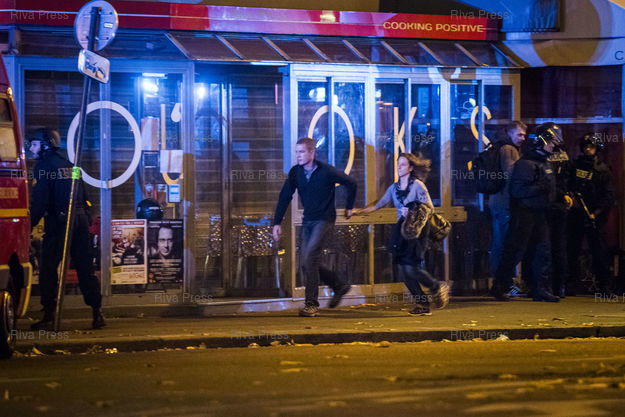 Légende : PARIS, 13/11/2015 - Des personnes courent se mettre a l'abri boulevard Voltaire, a quelques metres du Bataclan alors qu'une attaque terroriste contre les spectateurs d'un concert est en cours dans cette salle de spectacle du 11eme arrondissement. /// People flee the Bataclan concert hall in central Paris, on November 13, 2015 during the terrorist attack where 90 persons were killed and hundreds injured. /// PHOTO Vincent BOISOT