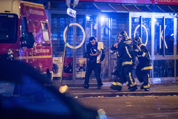 Légende : PARIS, 13/11/2015 - Des blesses sont evacues boulevard Voltaire devant le Bataclan alors qu'une attaque terroriste contre les spectateurs d'un concert est en cours dans cette salle de spectacle du 11eme arrondissement. /// Rescue workers evacuate an injured person near the Bataclan concert hall in central Paris, on November 13, 2015 during the terrorist attack where 90 persons were killed and hundreds injured. /// PHOTO Vincent BOISOT