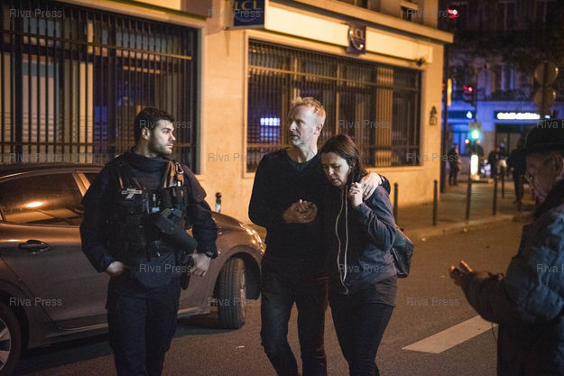 Légende : PARIS, 13/11/2015 - Des rescapes de l'attaque terroriste au Bataclan quittent les lieux au niveau du boulevard Voltaire apres que l'assaut a ete donne par les forces de l'ordre. /// Survivors of the terrorist attack at the Bataclan concert hall in the center of Paris leave the scene after the assault was given by the police. 90 persons were killed and hundreds injured in this attack. /// PHOTO Vincent BOISOT