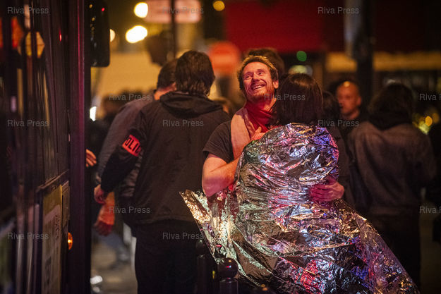 Légende : PARIS, 13/11/2015 - Des rescapes de l'attaque terroriste au Bataclan quittent les lieux au niveau du boulevard Voltaire apres que l'assaut a ete donne par les forces de l'ordre. /// Survivors of the terrorist attack at the Bataclan concert hall in the center of Paris leave the scene after the assault was given by the police. 90 persons were killed and hundreds injured in this attack. /// PHOTO Vincent BOISOT