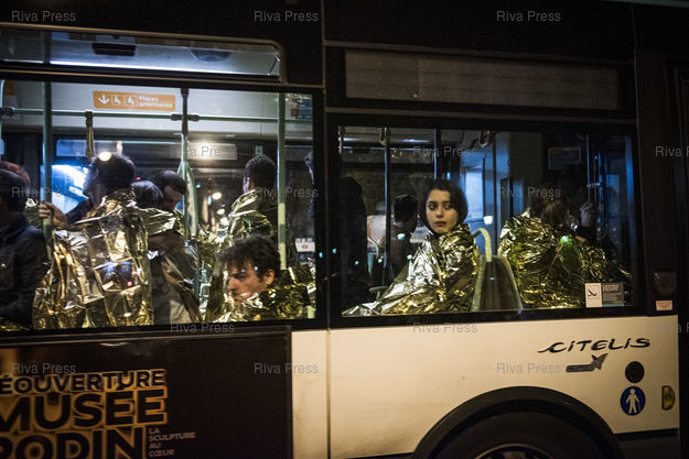 Légende : PARIS, 14/11/2015 - Des rescapes de l'attaque terroriste au Bataclan sont evacues en bus de la RATP au niveau du boulevard Voltaire apres que l'assaut a ete donne par les forces de l'ordre. /// Survivors sit on a bus after the terrorist attack at the Bataclan concert hall in the center of Paris. 90 persons were killed and hundreds injured in this attack. /// PHOTO Vincent BOISOT