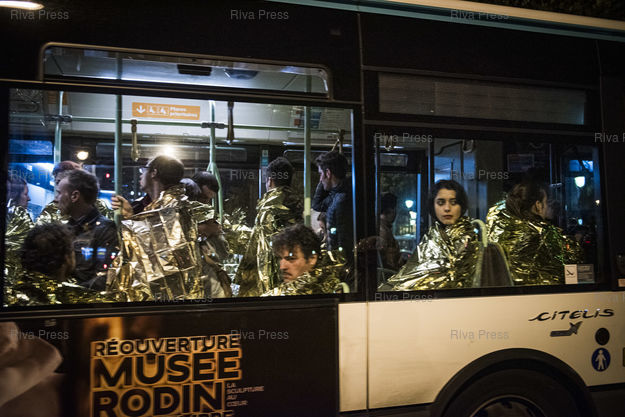 Légende : PARIS, 14/11/2015 - Des rescapes de l'attaque terroriste au Bataclan sont evacues en bus de la RATP au niveau du boulevard Voltaire apres que l'assaut a ete donne par les forces de l'ordre. /// Survivors sit on a bus after the terrorist attack at the Bataclan concert hall in the center of Paris. 90 persons were killed and hundreds injured in this attack. /// PHOTO Vincent BOISOT