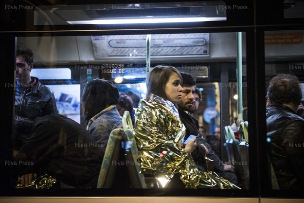 Légende : PARIS, 14/11/2015 - Des rescapes de l'attaque terroriste au Bataclan sont evacues en bus de la RATP au niveau du boulevard Voltaire apres que l'assaut a ete donne par les forces de l'ordre. /// Survivors sit on a bus after the terrorist attack at the Bataclan concert hall in the center of Paris. 90 persons were killed and hundreds injured in this attack. /// PHOTO Vincent BOISOT