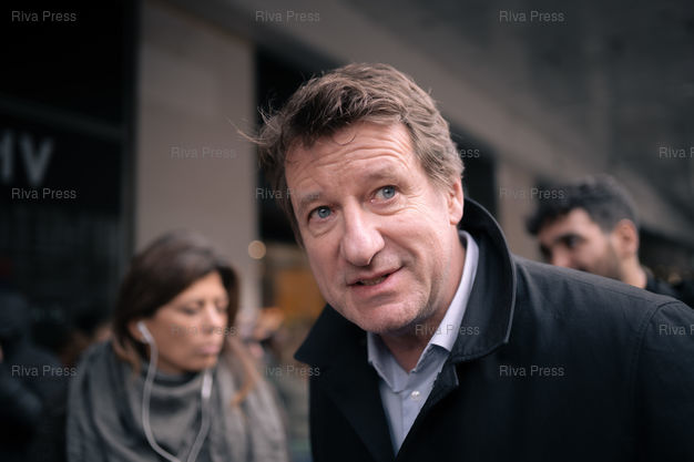 Légende : Green Party Senator Jannick Jadot outside BHV on the day of the opening of the Chinese brand's first physical store, located in the Marais district of Paris's 6th arrondissement. The Greens oppose the working conditions of employees at the ultra-fast fashion giant, the environmental consequences of its operations, and are reacting to the scandal of child pornography dolls offered on the brand's website. Several hundred customers positioned themselves up to three hours before opening time to enter the more than 1,000 square meters dedicated to the Shein corner on the 6th floor of the famous Parisian department store. Paris, November 5, 2025. Teo Manisier / Riva Press. ///
