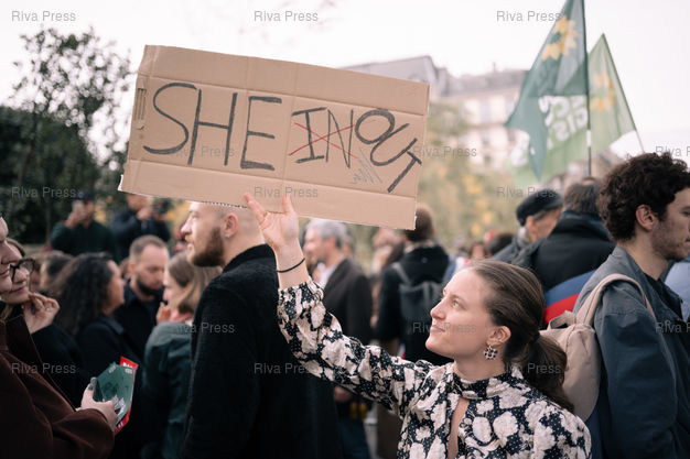 Légende : Des manifestants protestent contre l'ouverture de Shein au BHV, le jour de l'ouverture de la premiere boutique physique de la marque chinoise, au BHV dans le Marais, dans le 6e arrondissement de Paris. Ils s'opposent aux conditions de travail des employes du geant de l'ultra fast fashion, des consequences environnementales de son activite, et reagissent au scandale des poupees pedopornographiques proposees sur le site de la marque. Plusieurs centaines de clients se sont positionnes jusqu'a trois heures avant l'ouverture pour penetrer sur les plus de 1000m2 dedies au corner Shein, au 6e etage du celebre magasin parisien. Paris, 5 novembre 2025. Teo Manisier / Riva Press. /// Protesters demonstrate against the opening of Shein at BHV on the day of the Chinese brand's first physical store opening in the Marais district of Paris's 6th arrondissement. They oppose the working conditions of employees at the ultra-fast fashion giant, the environmental consequences of its operations, and react to the scandal of child pornography dolls offered on the brand's website. Several hundred customers positioned themselves up to three hours before opening to enter the more than 1,000 square meters dedicated to the Shein corner on the 6th floor of the famous Parisian department store. Paris, November 5, 2025. Teo Manisier / Riva Press.