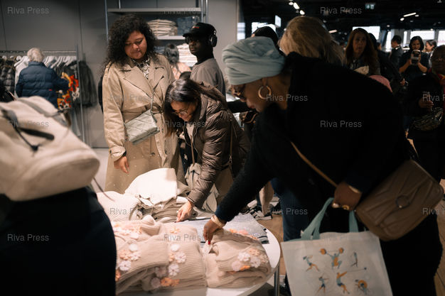 Légende : Des clients le jour de l'ouverture de la premiere boutique physique de la marque chinoise d'ultra fast fashion Shein, au BHV dans le Marais, dans le 6e arrondissement de Paris. Plusieurs centaines de clients se sont positionnes jusqu'a trois heures avant l'ouverture pour penetrer sur les plus de 1000m2 dedies au corner Shein, au 6e etage du celebre magasin parisien, malgre la presence de manifestants protestant contre les conditions de travail des employes de la marque, les consequences environnementales de son activite et les scandales des poupees pedopornographiques vendues sur son site. Paris, 5 novembre 2025. Teo Manisier / Riva Press. /// Customers on the day of the opening of the first physical store of the Chinese ultra-fast fashion brand Shein, at BHV in the Marais district of Paris's 6th arrondissement. Several hundred customers positioned themselves up to three hours before opening to enter the more than 1,000 square meters dedicated to the Shein corner on the 6th floor of the famous Parisian department store, despite the presence of protesters demonstrating against the working conditions of the brand's employees, the environmental consequences of its business, and the scandals involving child pornography dolls sold on its website. Paris, November 5, 2025. Teo Manisier / Riva Press. ///