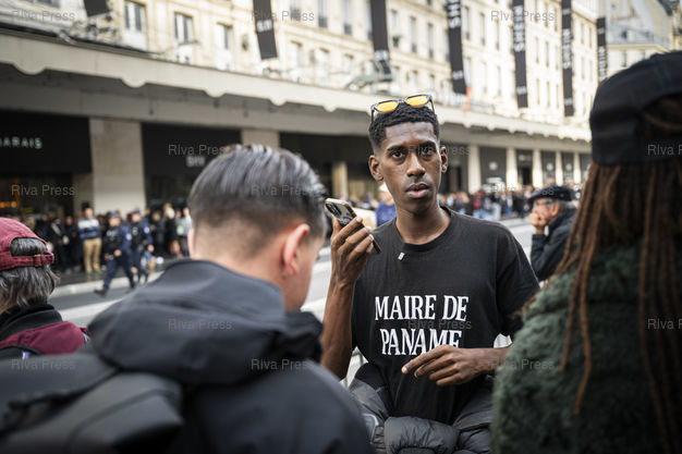 Légende : Encadre par un important dispositif policier, des centaines de clients font la queue rue de Rivoli a Paris pour acceder a la boutique Shein du BHV. C'est la premiere fois que le geant chinois de l'e-commerce ouvre une boutique physique et perenne dans le monde. De l'autre cote de la rue, quelques dizaines de manifestants (dont l'influenceur "Willy a la Prod", sur la photo) protestent contre le modele social et environnemental de cette marque d'ultra fast fashion. Le 05/11/2025 /// Surrounded by a large police presence, hundreds of customers queued on Rue de Rivoli in Paris to enter the Shein store in the BHV department store. This is the first time the Chinese e-commerce giant has opened a permanent physical store anywhere in the world. Across the street, a few dozen protesters (including the influencer "Willy a la Prod", pictured) demonstrated against the social and environmental model of this ultra-fast fashion brand. On November 5, 2025 /// PHOTO Vincent Boisot