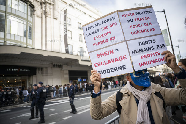 Légende : Encadre par un important dispositif policier, des centaines de clients font la queue rue de Rivoli a Paris pour acceder a la boutique Shein du BHV. C'est la premiere fois que le geant chinois de l'e-commerce ouvre une boutique physique et perenne dans le monde. De l'autre cote de la rue, quelques dizaines de manifestants protestent contre le modele social et environnemental de cette marque d'ultra fast fashion. Le 05/11/2025 /// Surrounded by a large police presence, hundreds of customers queued on Rue de Rivoli in Paris to enter the Shein store in the BHV department store. This is the first time the Chinese e-commerce giant has opened a permanent physical store anywhere in the world. Across the street, a few dozen protesters demonstrated against the social and environmental model of this ultra-fast fashion brand. On November 5, 2025 /// PHOTO Vincent Boisot